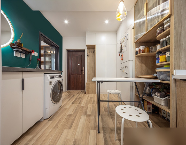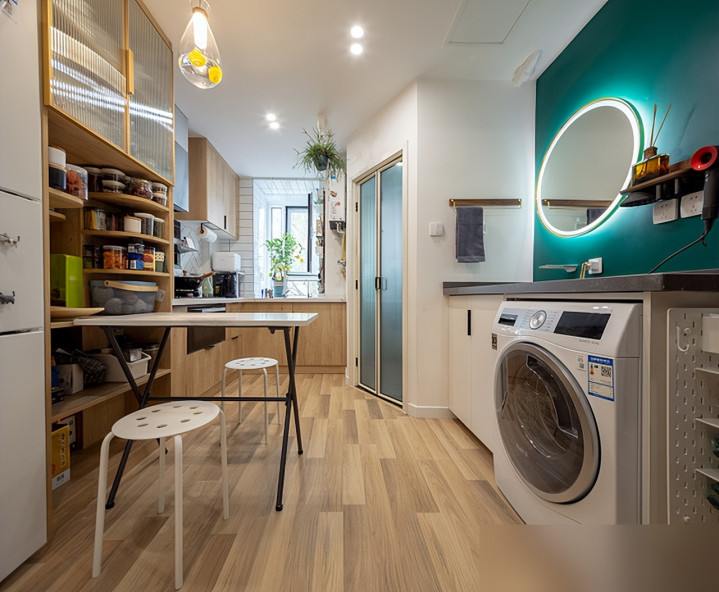 最绝的是那种客餐厅打通的操作,餐桌贴着厨房岛台放,吃完饭碗筷直接转身塞洗碗机,动线顺得像滑冰。