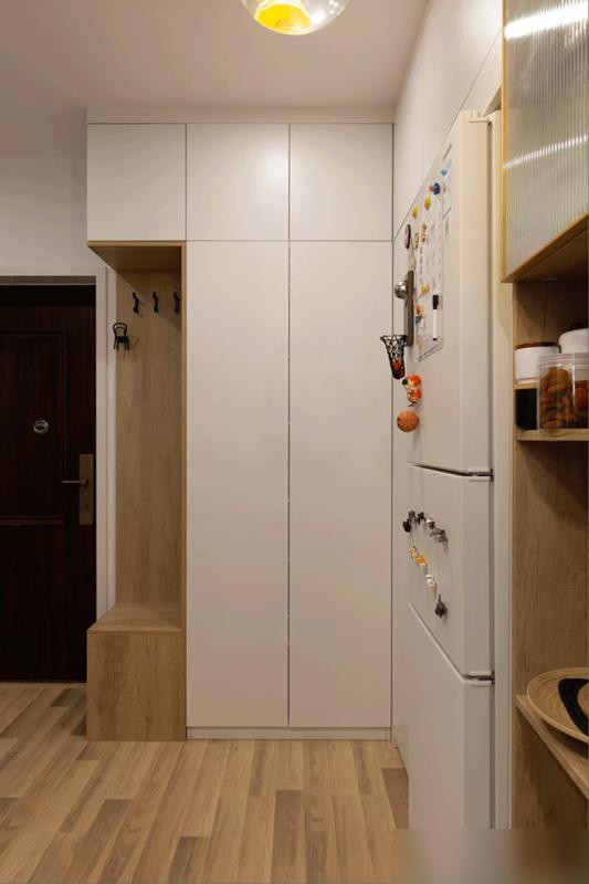 旋转鞋架算基础操作了,冰箱和洗衣机夹缝那十几公分塞个抽拉式窄柜,囤洗衣液抽纸刚刚好。